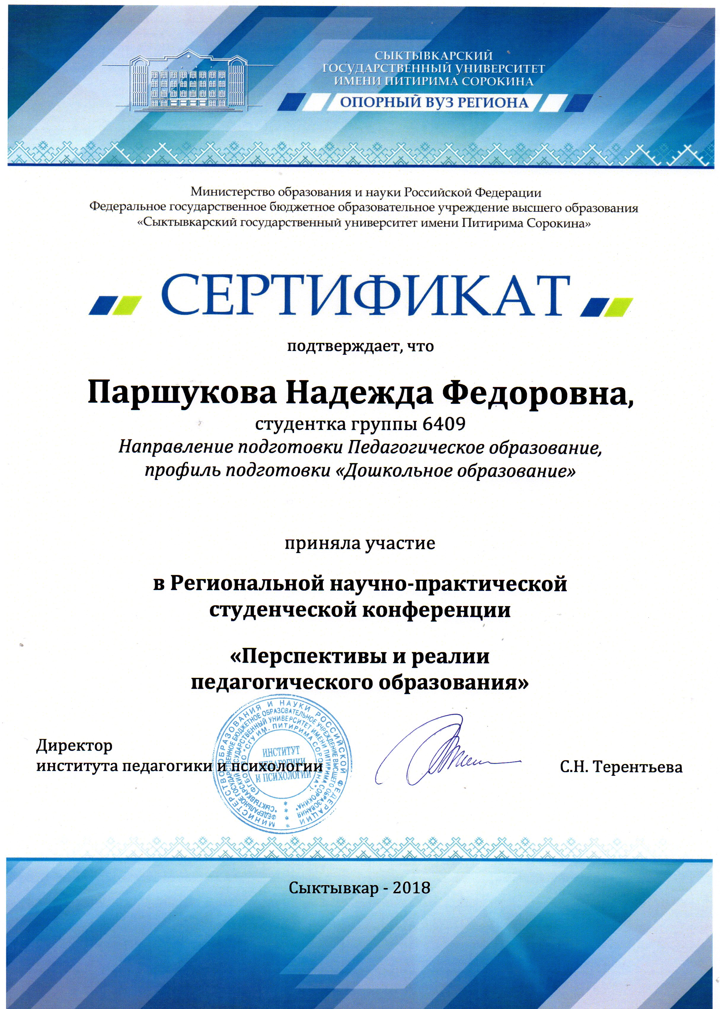 Сертификат подтверждает, что приняла участие в Региональной научно - практической студенческой конференции "Перспективы и реалии педагогического образования" 2018 год.