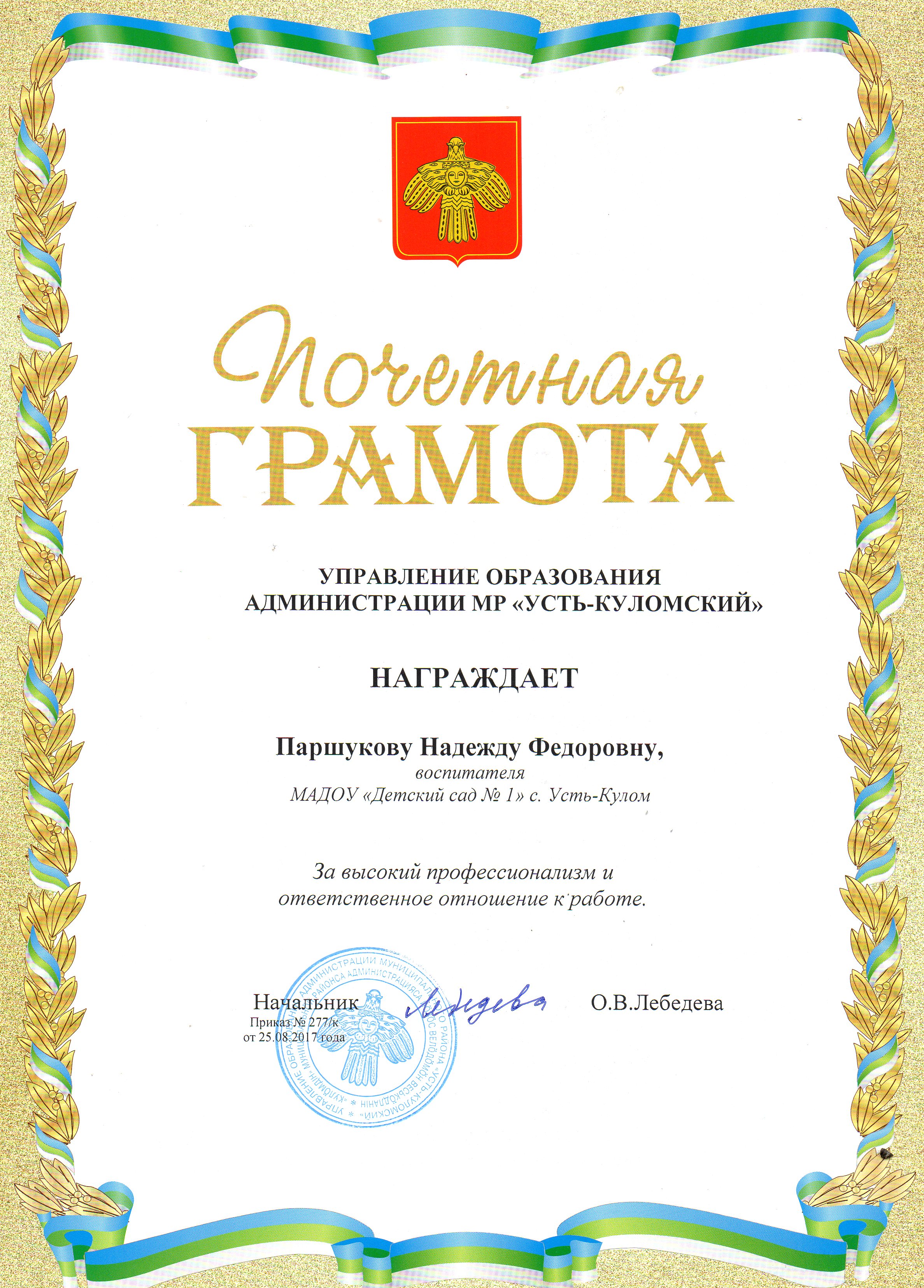 Почетная грамота УПРАВЛЕНИЯ ОБРАЗОВАНИЯ АДМИНИСТРАЦИИ МР "УСТЬ- КУЛОМСКИЙ" "За высокий профессионализм и ответственное отношение к работе ".