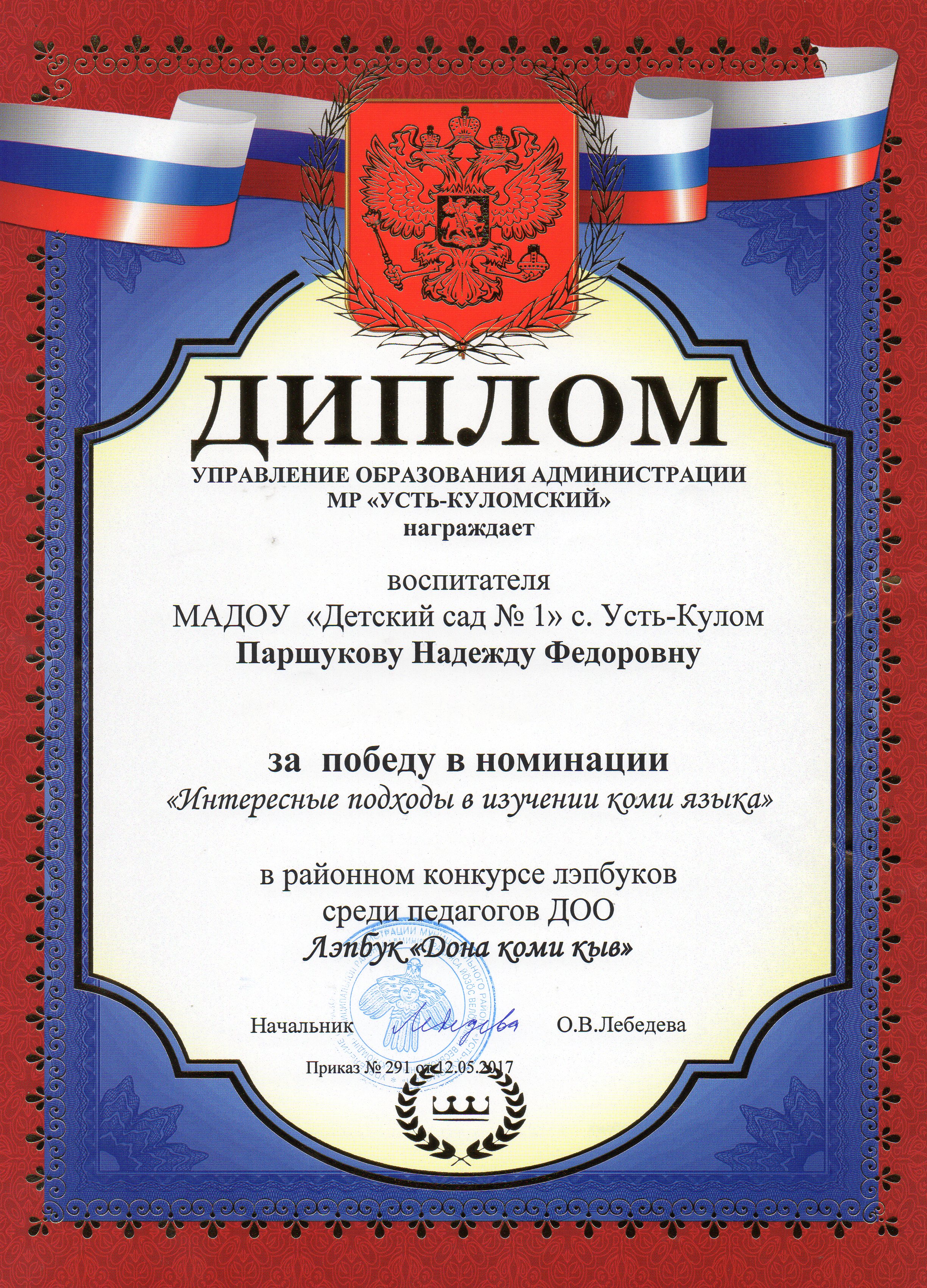 Диплом УПРАВЛЕНИЯ ОБРАЗОВАНИЯ АДМИНИСТРАЦИИ МР "УСТЬ- КУЛОМСКИЙ" за победу в номинации "Интересные подходы в изучении коми языка".