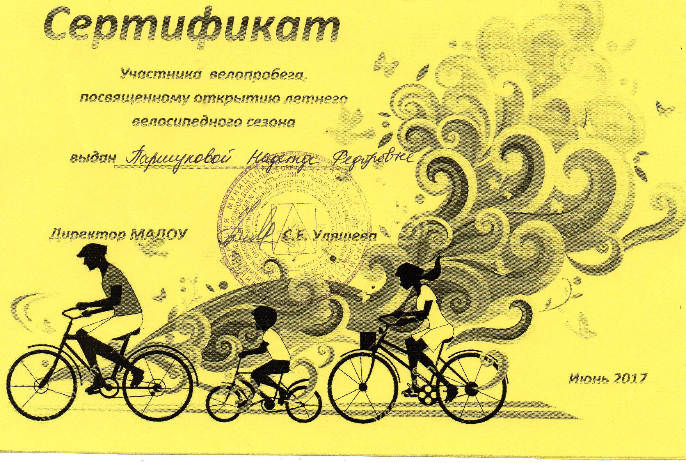 Сертификат участника велопробега, посвященного открытию летнего велосипедного сезона.
