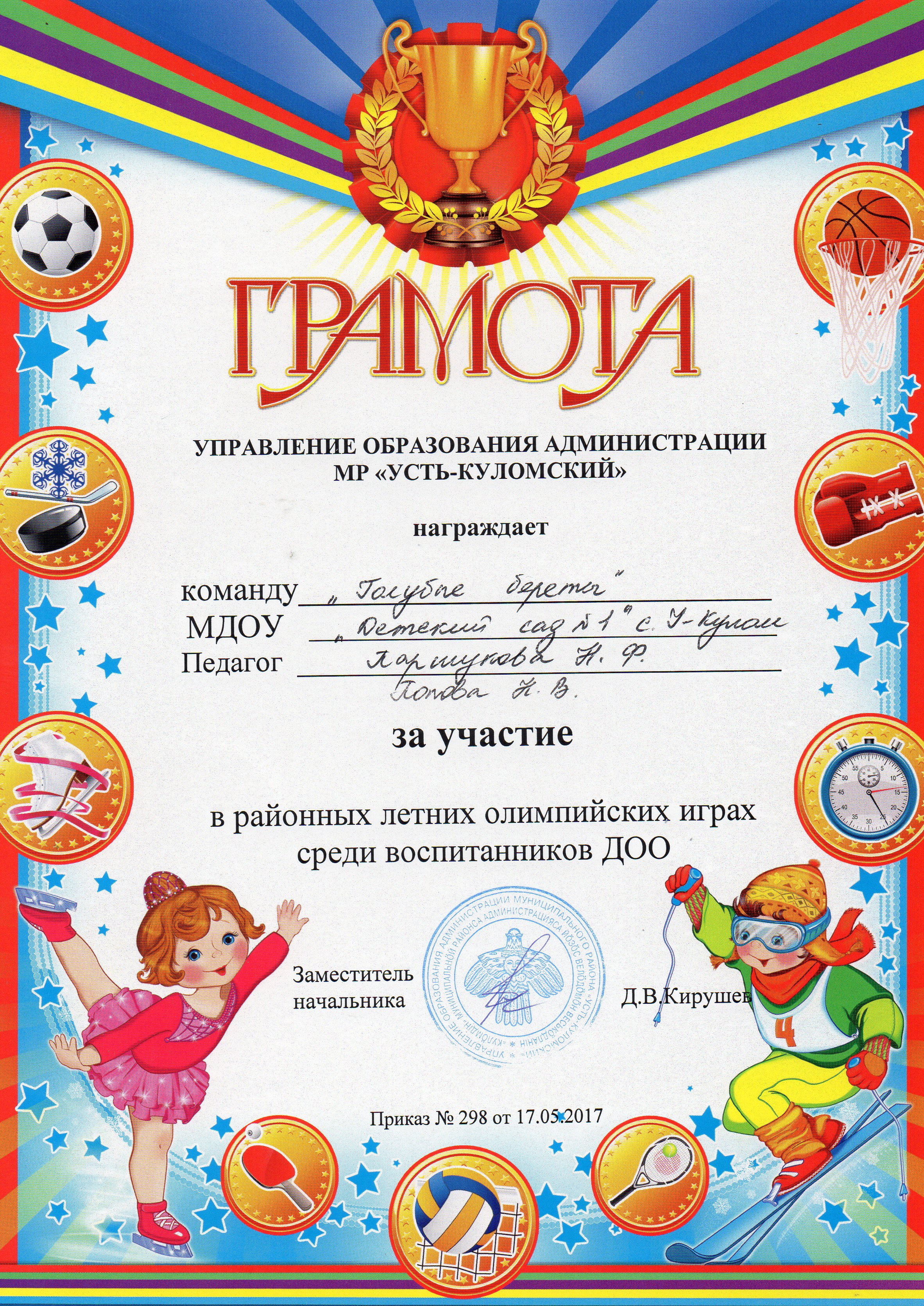 Грамота УПРАВЛЕНИЯ ОБРАЗОВАНИЯ АДМИНИСТРАЦИИ МР "УСТЬ- КУЛОМСКИЙ" за участие в районных детских олимпийских играх среди воспитанников ДОО.