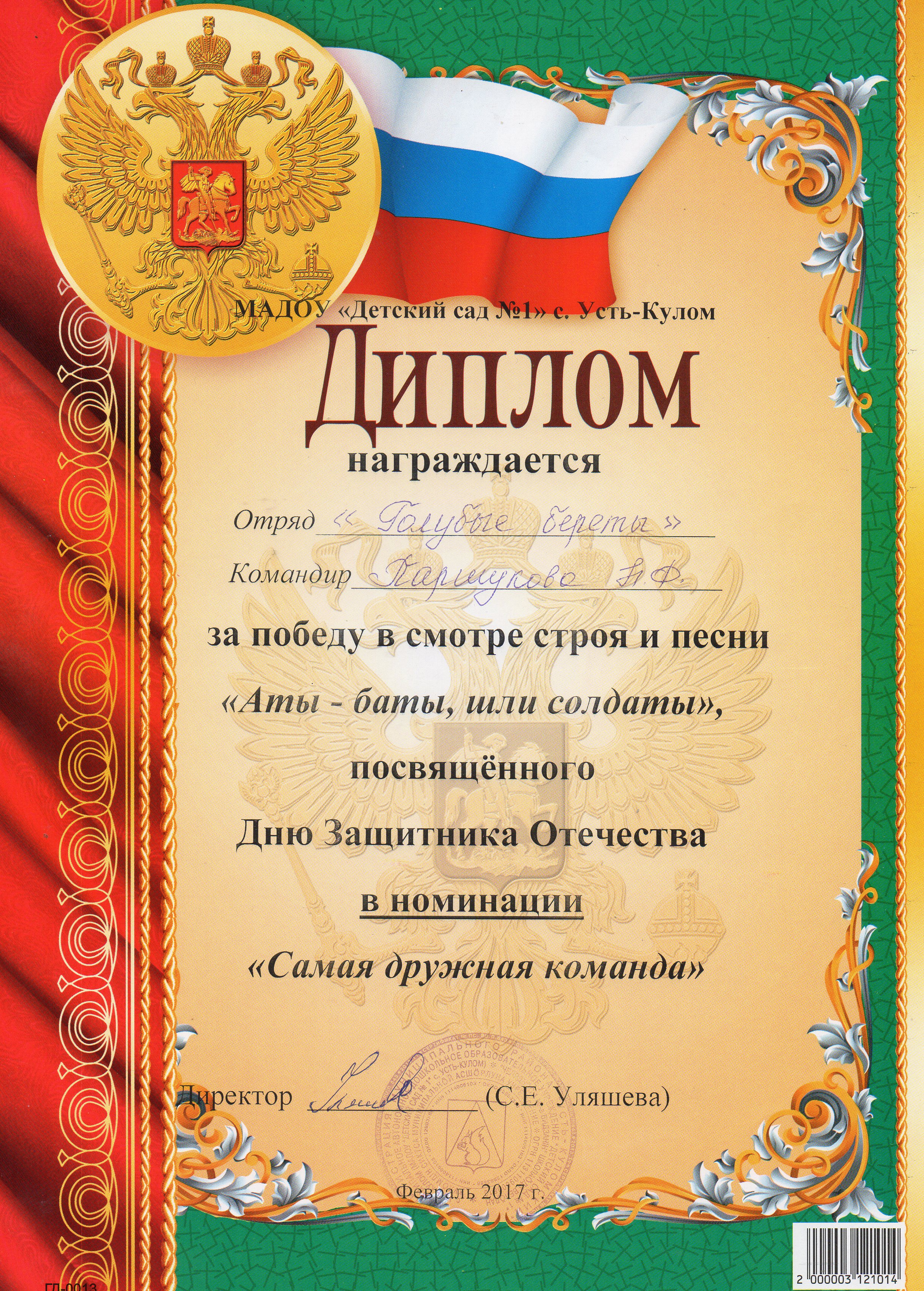 Грамота МАДОУ "Детский сад № 1" с.Усть-кулом за 2 место в смотре строя и песни "Аты-баты, шли солдаты" посвященного Дню Защитника Отечества.
