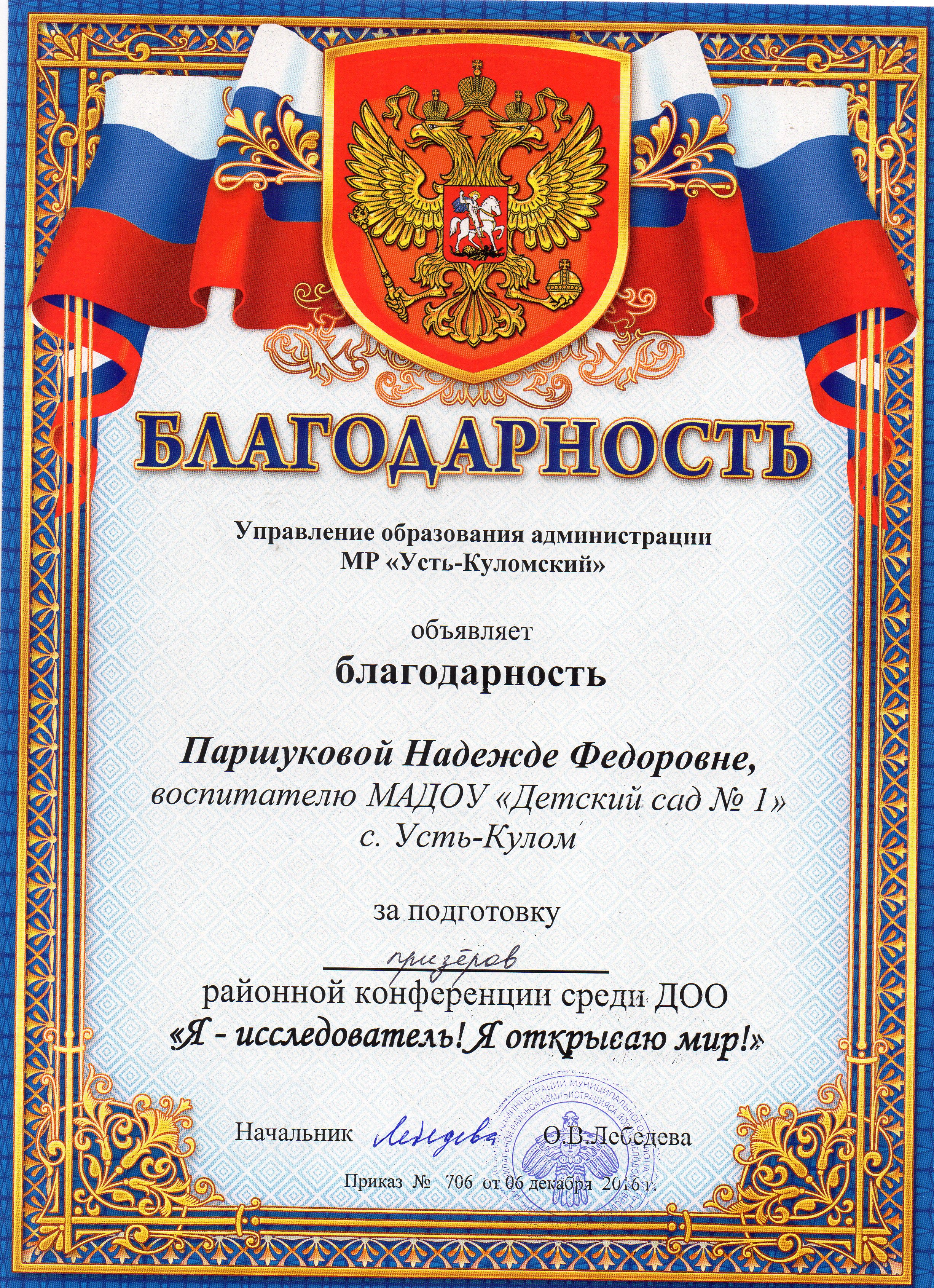 Благодарность УПРАВЛЕНИЯ ОБРАЗОВАНИЯ АДМИНИСТРАЦИИ МР "УСТЬ- КУЛОМСКИЙ" за подготовку призеров районной конференции среди ДОО "Я- исследователь! Я открываю мир!".
