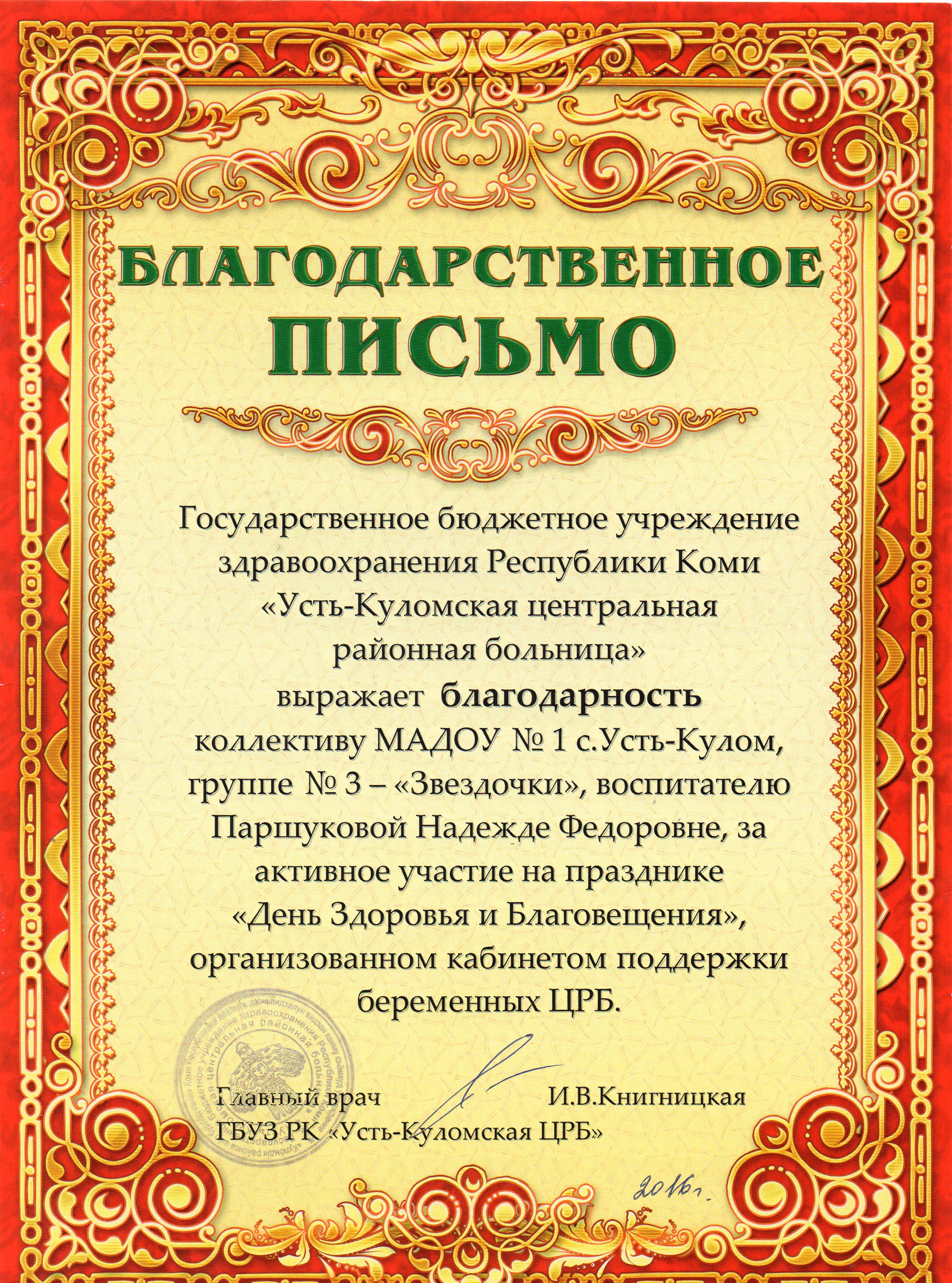 Благодарственное письмо ГБУЗ РК "Усть-Куломская ЦРБ" за активное участие в празднике "День Здоровья и Благовещения".