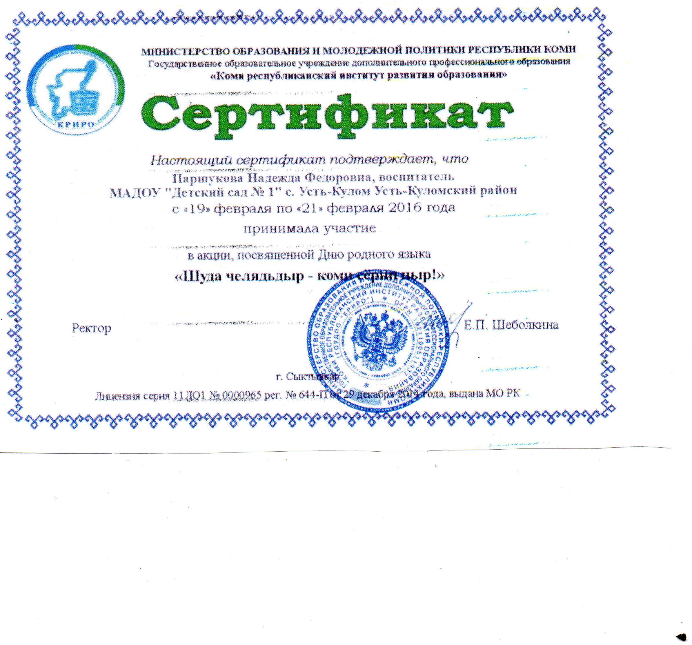 Сертификат участника акции "Шуда челядьдыр - коми серни пыр".