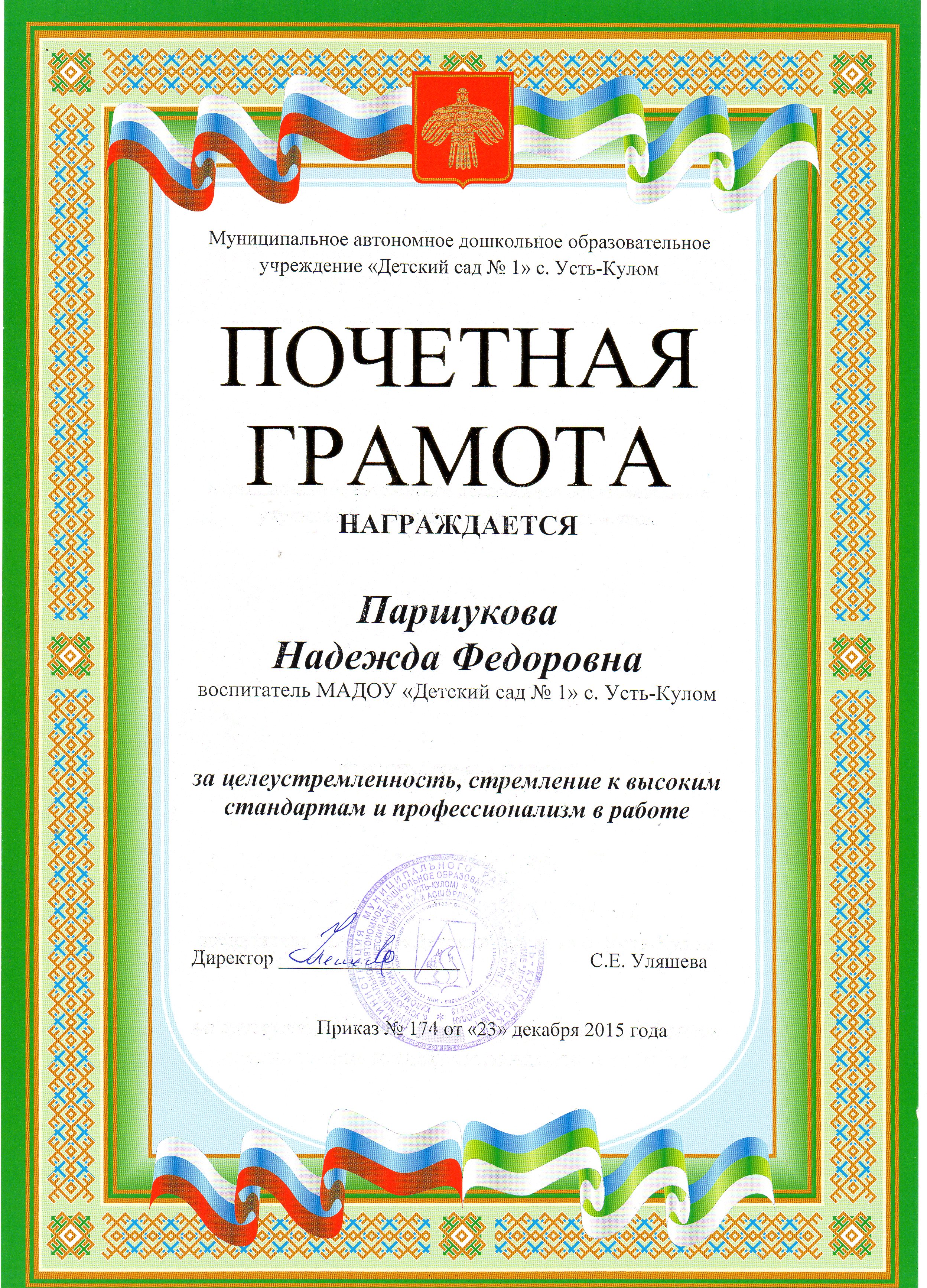 Почетная грамота МАДОУ "Детский сад № 1" с.Усть-Кулом за целеустремленность, стремление к высоким стандартам и профессионализм в работе.