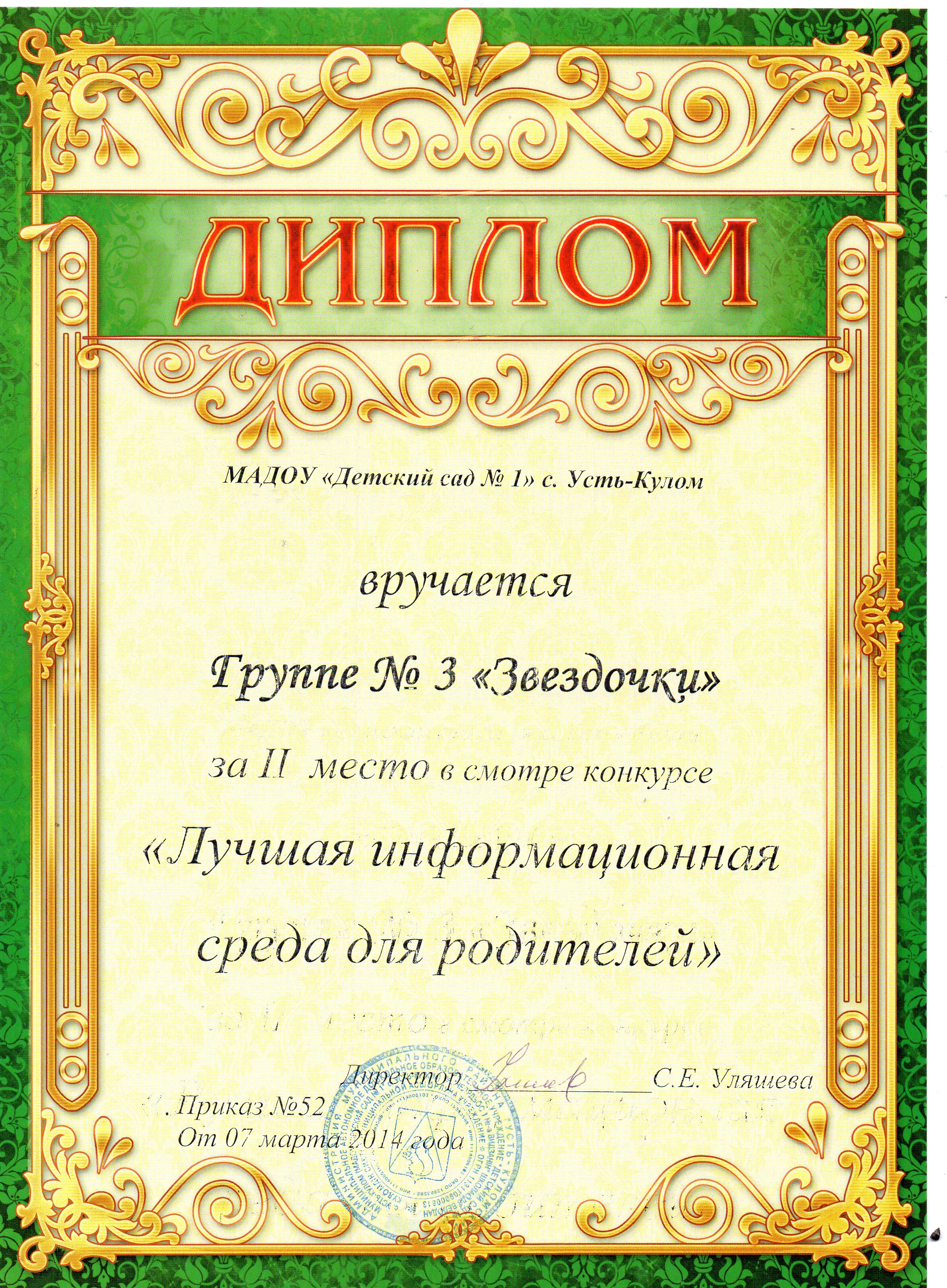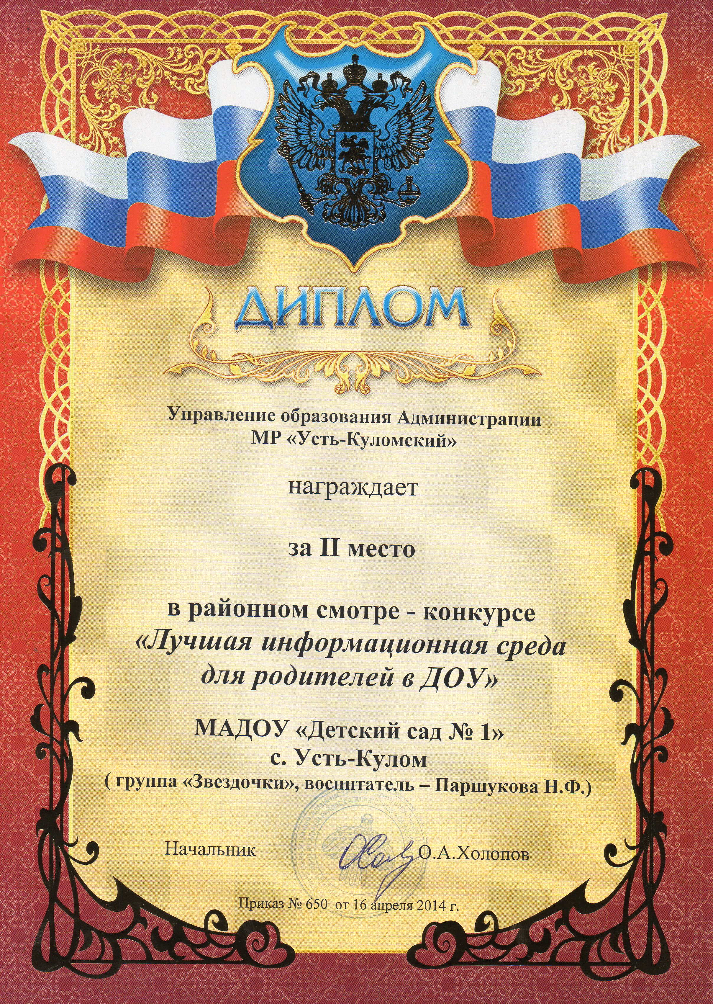 Диплом УПРАВЛЕНИЯ ОБРАЗОВАНИЯ АДМИНИСТРАЦИИ МР "УСТЬ- КУЛОМСКИЙ" за 2 место в районном смотре-конкурсе "Лучшая информационная среда для родителей в ДОУ"