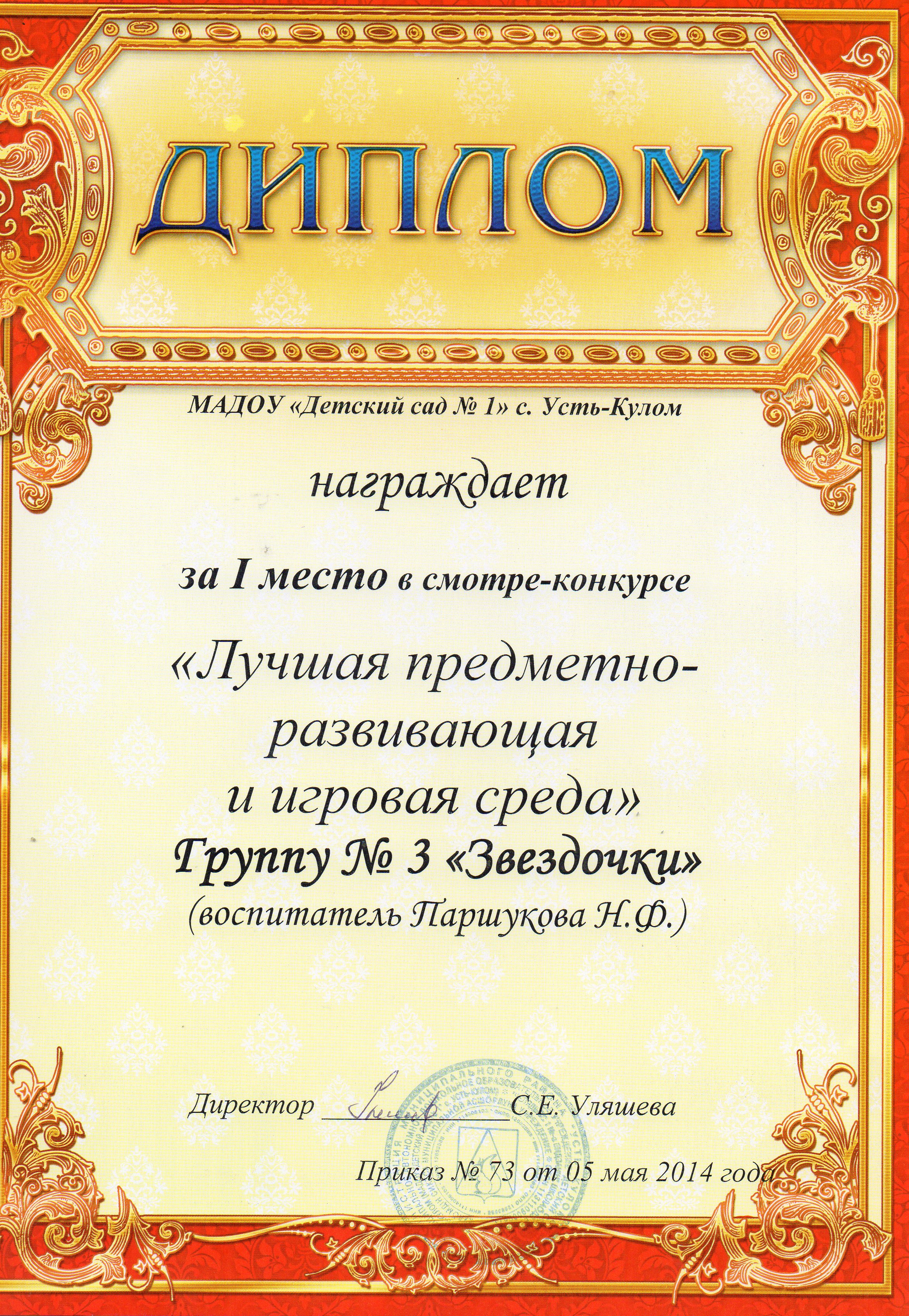 Диплом МАДОУ "Детский сад № 1"с. Усть-Кулом за 1 место в смотре конкурсе "Лучшая предметно-пространственная среда".