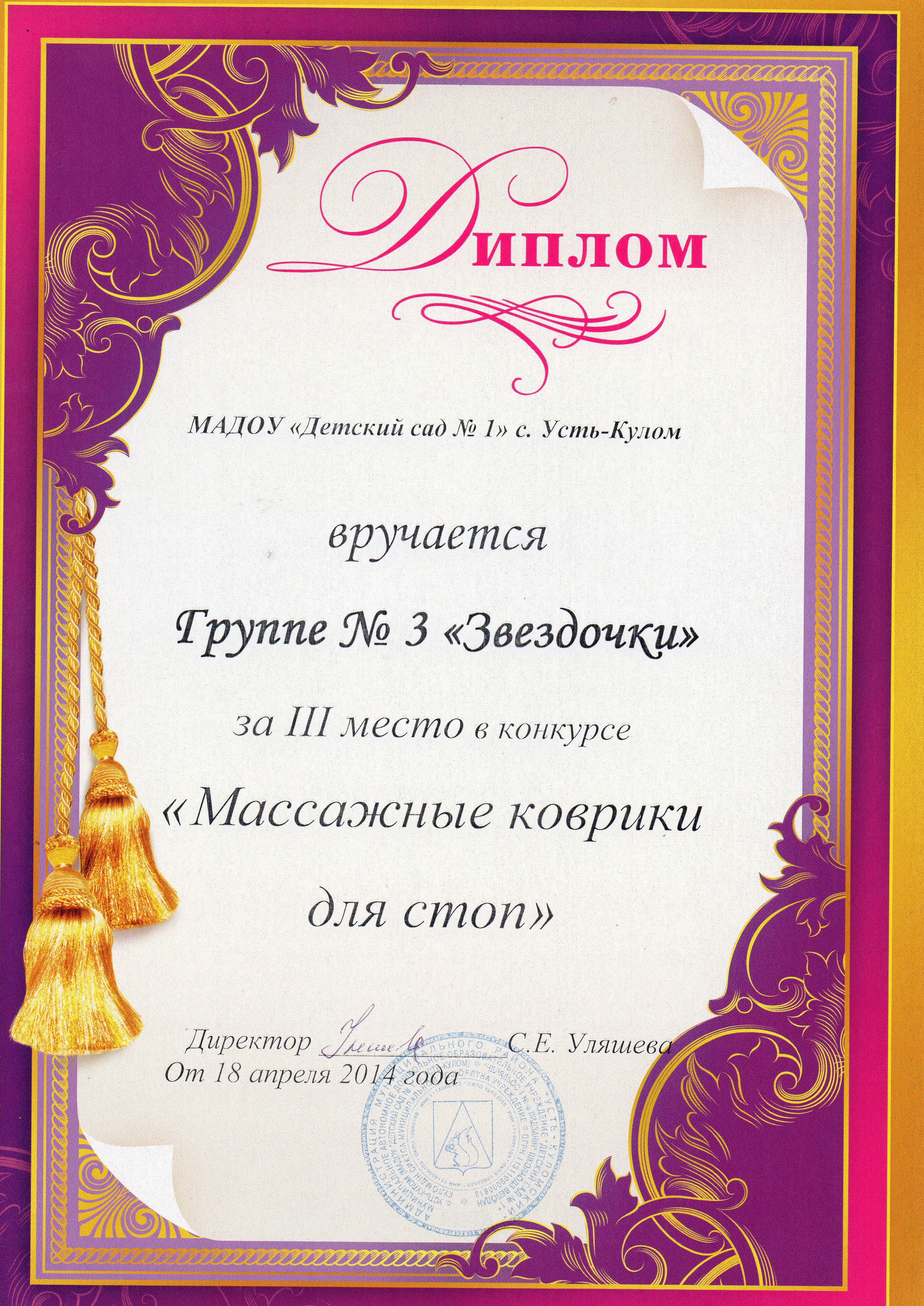 Диплом МАДОУ "Деский сад № 1" с.Усть-Кулом за 3 место в конкурсе "Массажные коврики для стоп".