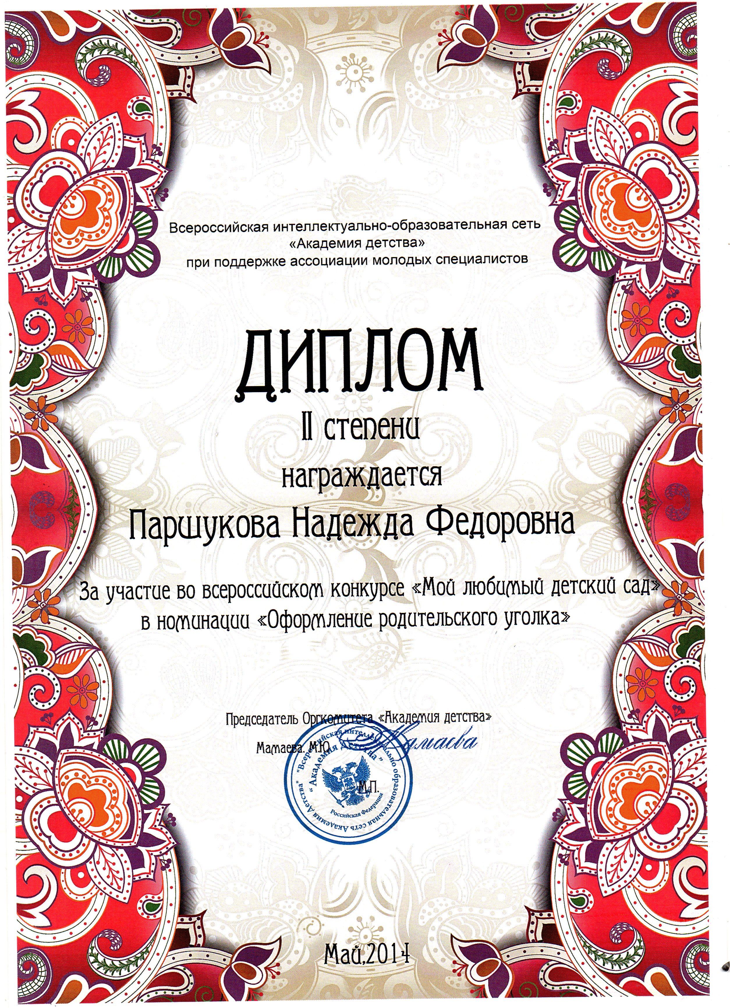 Диплом 2 степени за участие во всероссийском конкурсе "Мой любимый детский сад"